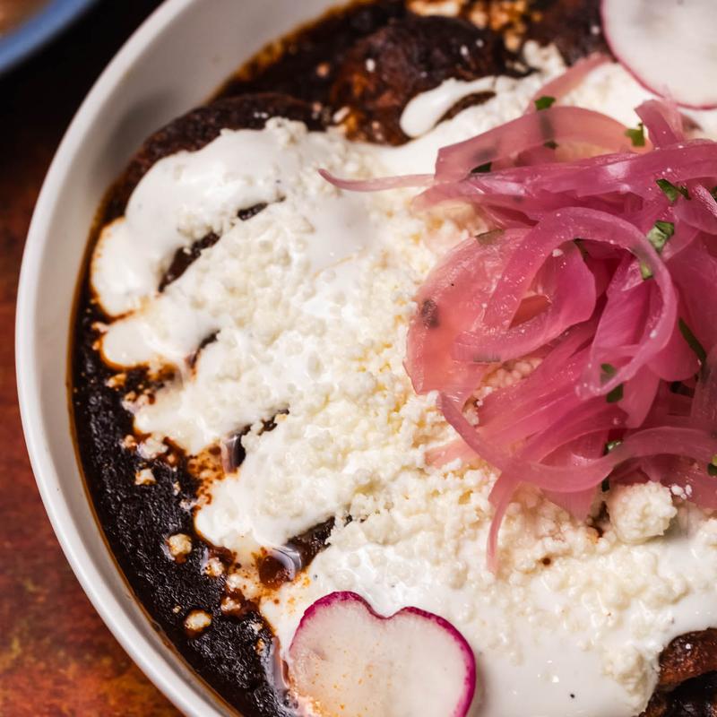 Choice of salsa verde or guajillo sauce. Queso fresco, crema,
