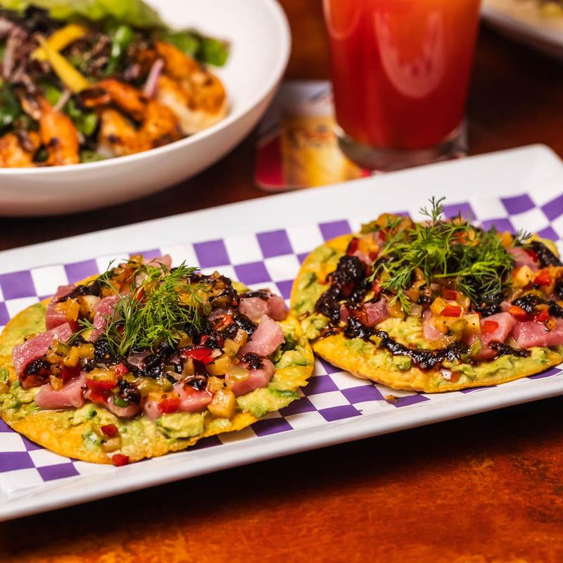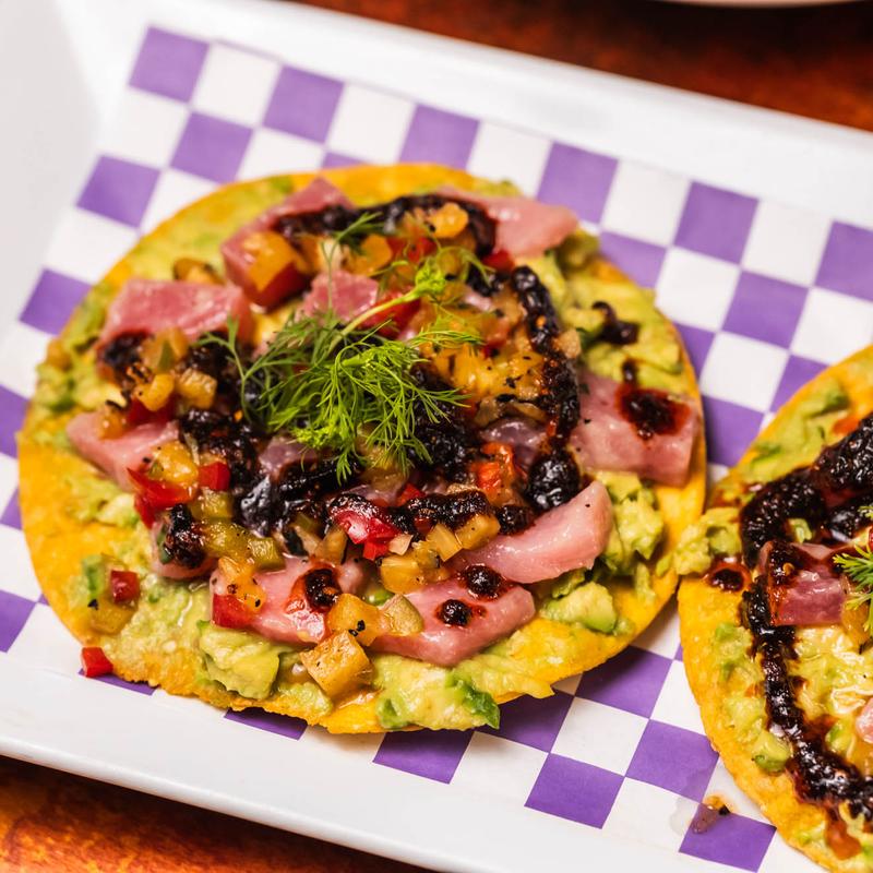 2 per order, avocado smash, pineapple relish, salsa macha, and cilantro.