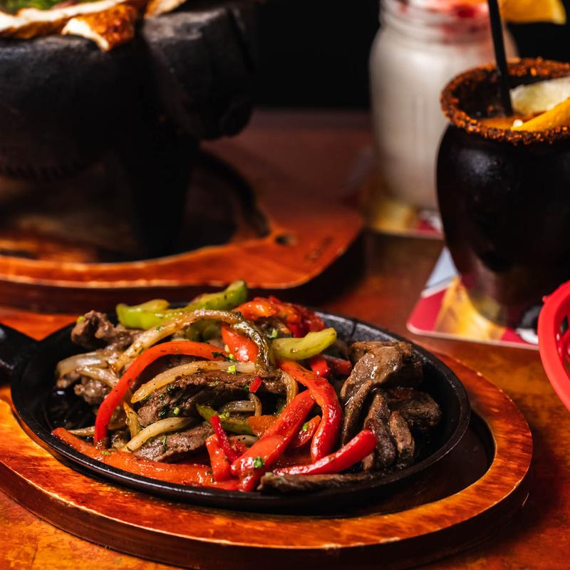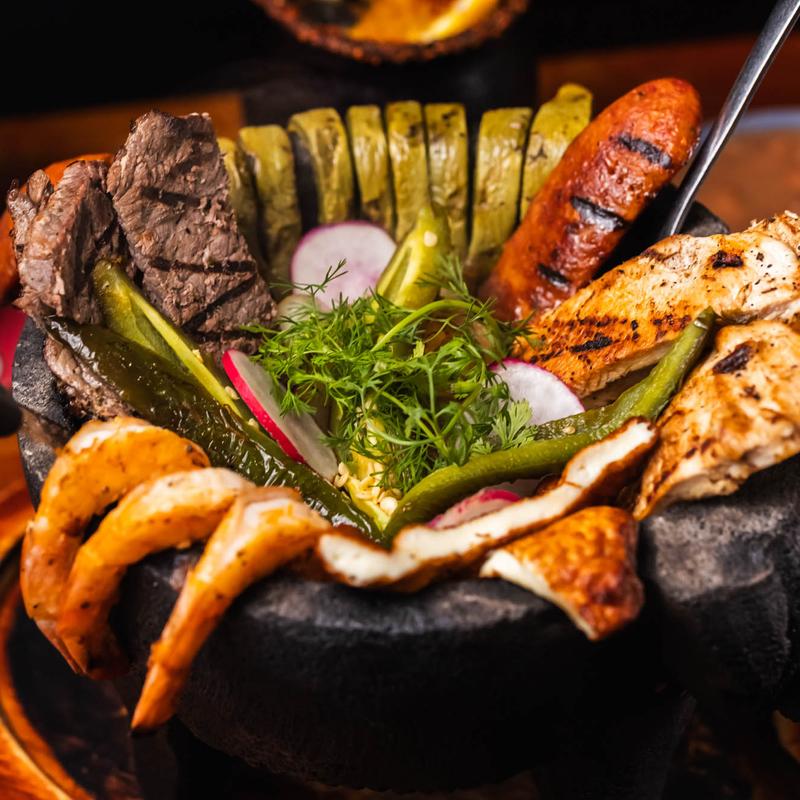 Steak, chicken, chorizo, three shrimps, queso frito, nopales, cebollitas, cilantro, and salsa macha.