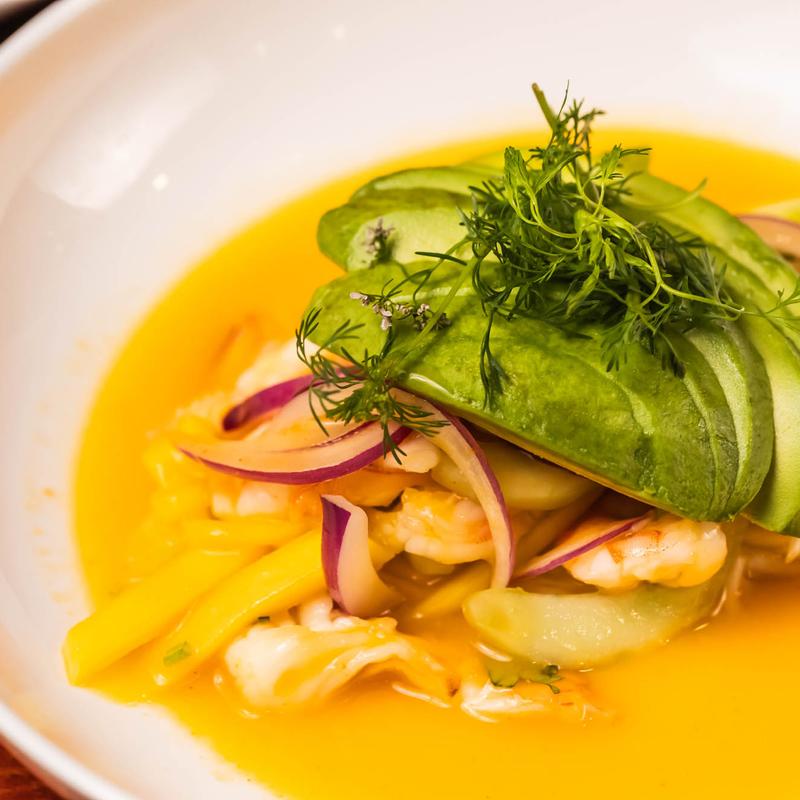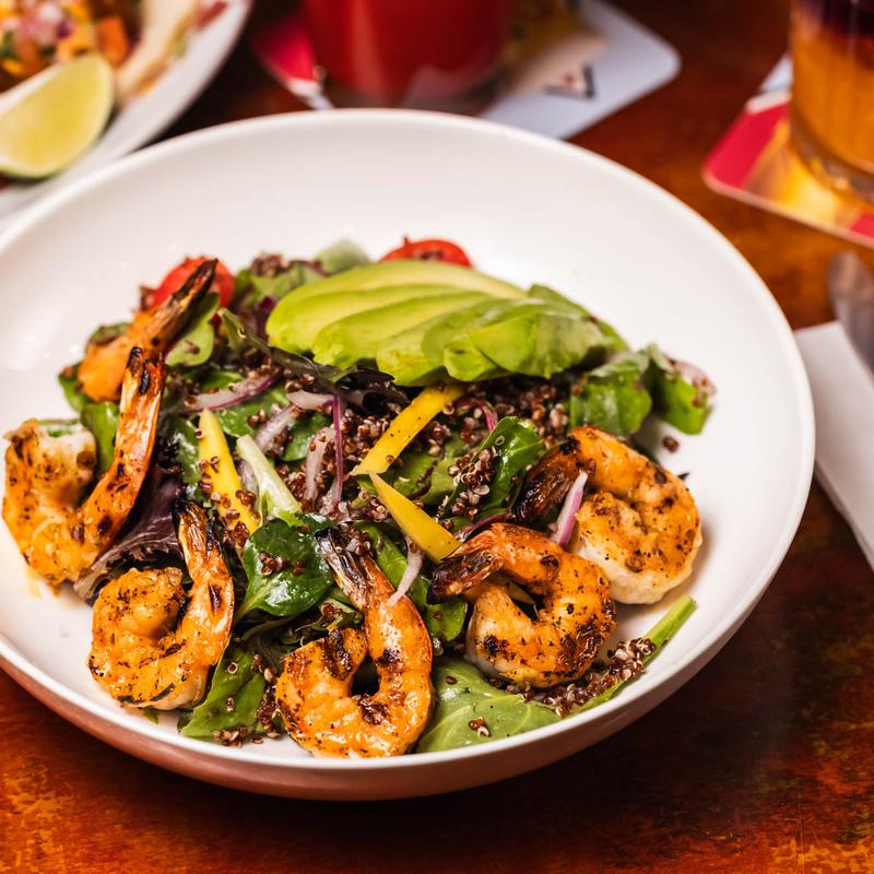 Shrimp, mango, cherry tomatoes, red onions, avocado, and sherry vinaigrette.
